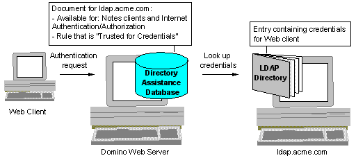 For example, if your organization registers Web users in a foreign LDAP directory, when a Web user attempts to access a database on a Domino Web server, the server can connect to the remote foreign LDAP directory server to look up the user name and password to do the authentication.