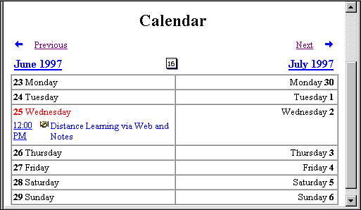 When you create a calendar view, you can give users the option to display the calendar in a variety of formats, such as Two-Day, Work-Week, Week, Two-Week, or Month. Calendar views also let users: